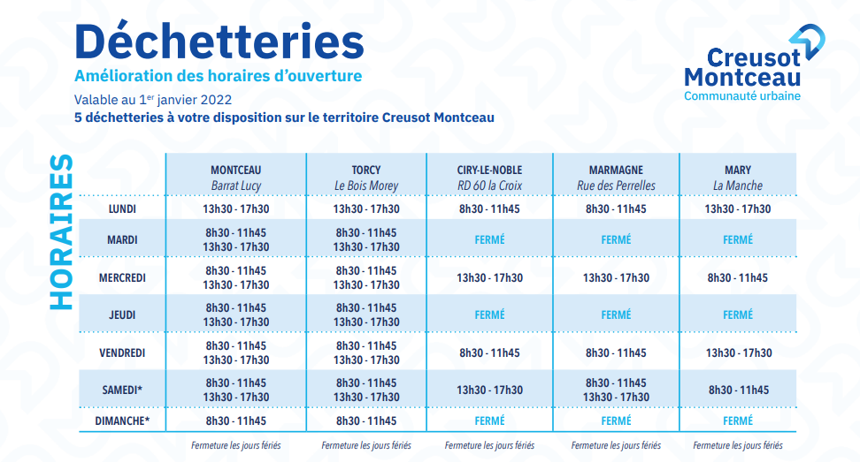 Retrouver ci-dessous les horaires d’ouvertures des déchetteries du territoire communautaire.