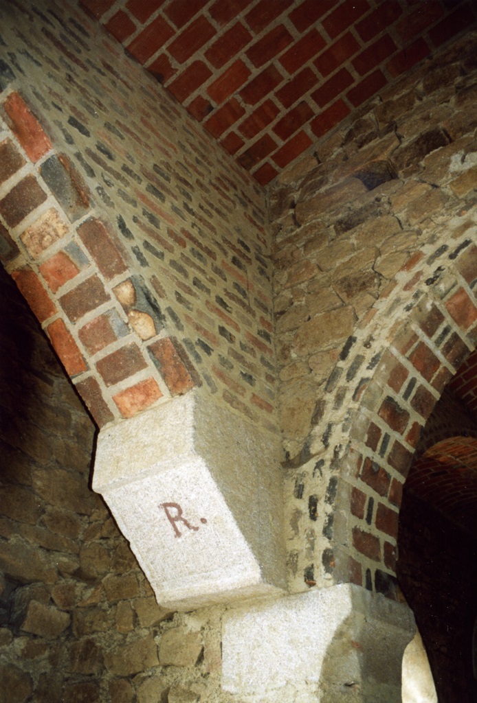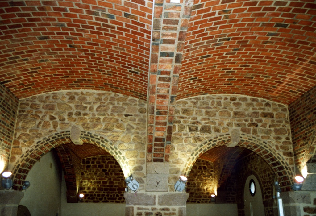 Une restauration habile met en valeur les voûtes des anciens préaux reconvertis en salle des fêtes et bibliothèque : arcs et entrevous briquetés, piliers, corbeaux et clés de voûtes en granit portant parfois une marque de tâcheron.