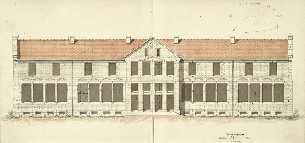 Le projet initial, qui prévoyait la construction d’un préau et de salles annexes (travaux manuels) en retour d’équerre, applique finalement le principe du préau-galerie dans-œuvre.