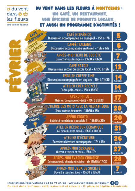 Programme du mois de févrer au Vent dans les fleurs, à Montcenis. Pour plus de détails, consultez le site web.