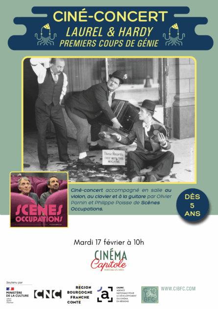 Le Capitole propose un ciné-concert autour de Laurel & Hardy – Premiers coups de génie. Des courts-métrages muets du duo mythique sont projetés sur grand écran, accompagnés d’une musique jouée en direct (clavier, violon et guitare) par Olivier Pornin et Philippe Poisse. Une séance tout public, accessible dès 5 ans, avec le soutien de l’Agence nationale pour le développement du cinéma en régions.