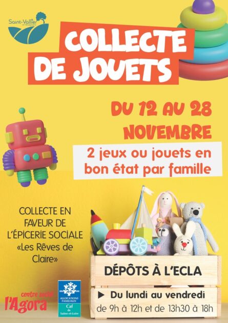 Comme chaque année, le centre social organise sa traditionnelle collecte de jouets. Cette collecte est en faveur de l’épicerie sociale “Les Rêves de Claire”. Du 12 au 28 novembre, vous pouvez déposer jusqu’à deux jeux ou jouets en bon état par famille à l’ECLA, du lundi au vendredi, pendant les heures d’ouverture.