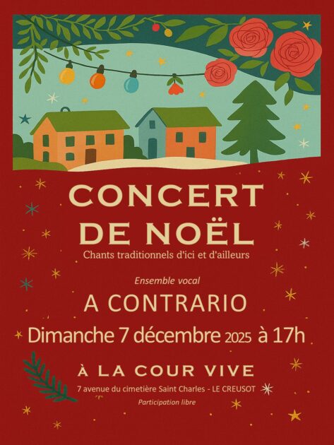 Nous sommes très heureux d’annoncer que La Cour Vive ouvrira grand ses portes au public le 7 décembre à 17h, pour une très belle soirée musicale de Noël. Nous aurons l’honneur d’accueillir l’ensemble vocal « A Contrario », un groupe dont les voix chaleureuses et complices savent transporter l’auditoire vers des horizons toujours plus beaux. Leur programme sera un véritable voyage : des chants traditionnels d’ici et d’ailleurs, empreint de douceur, de partage et d’espoir.