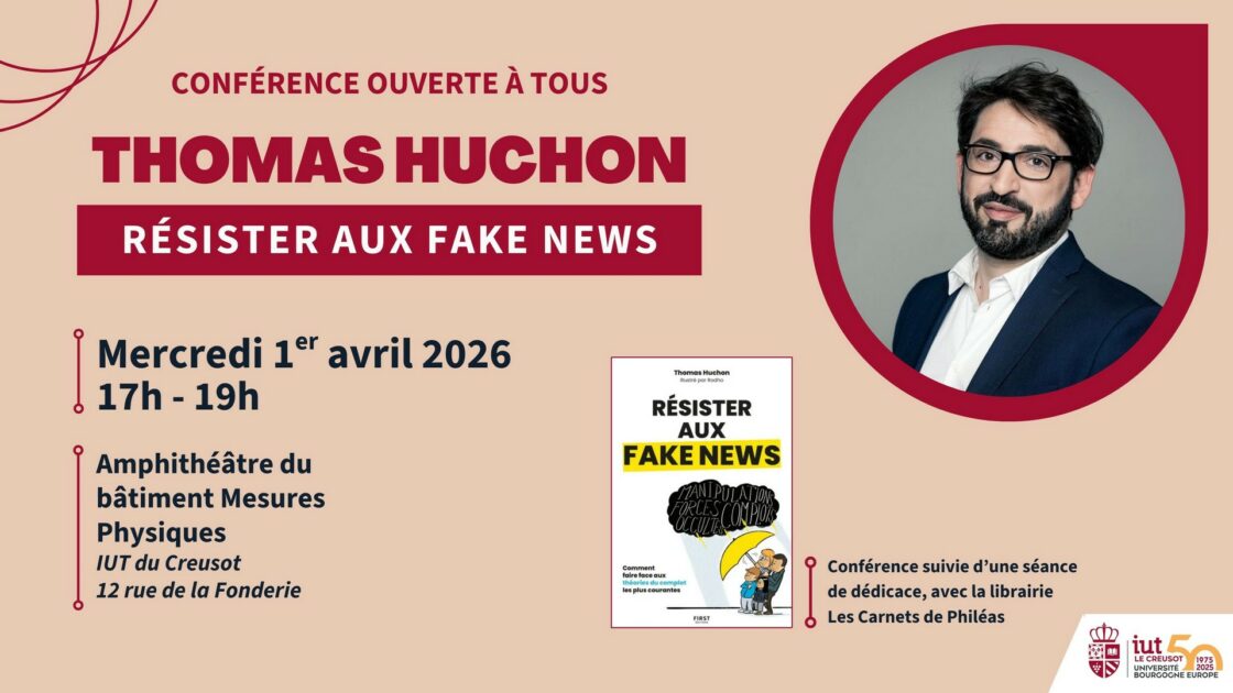Comment repérer les fake news et résister aux théories du complot ? C’est à cette question que répondra Thomas Huchon lors d’une conférence ouverte au grand public à l’IUT du Creusot. Journaliste et documentariste, Thomas Huchon travaille depuis plusieurs années sur les mécanismes de la désinformation et de la complosphère. Son nouveau livre paru en 2025, « Résister aux fake news : comment faire face aux théories du complot les plus courantes » pourra être dédicacé à la fin.