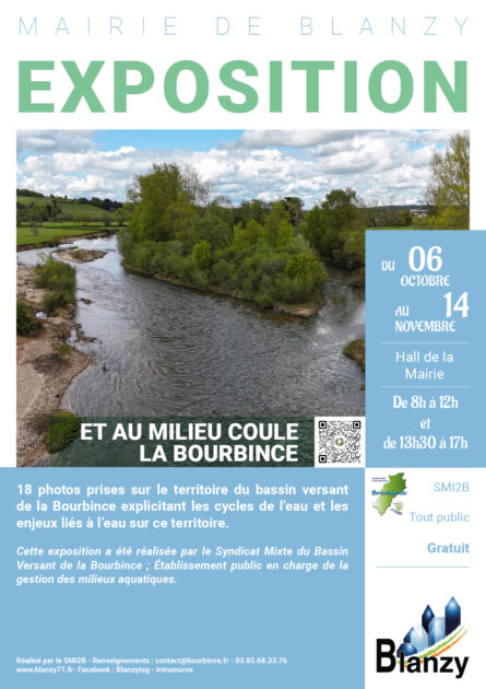 Cette exposition regroupe 18 photos prises sur le territoire du bassin versant de la Bourbince. Elle a été réalisée par le Syndicat Mixte du Bassin Versant de la Bourbince (SMi2B), établissement public en charge de la gestion des milieux aquatiques. Elle a pour principal objectif d’expliciter les cycles de l’eau et les enjeux liés à l’eau au sein du territoire. Ce territoire d’une superficie de 877 km², en tête du bassin versant de la Loire, compte plus de 850 km de cours d’eau et ruisseaux.