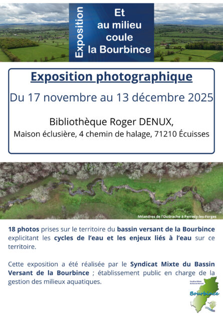 La bibliothèque a le plaisir d’accueillir l’exposition photographique “Et au milieu coule la Bourbince” du 17 novembre au 13 décembre 2025. 18 photos prises sur le territoire du bassin versant de la Bourbince. Elles expliquent le cycle de l’eau et les enjeux liés à l’eau. Une animation de présentation de l’exposition sera proposé le mardi 18 novembre 2025 à 17h30, suivie du verre de l’amitié. L’animation est assurée par le CPIE (centre permanent d’initiatives pour l’environnement).