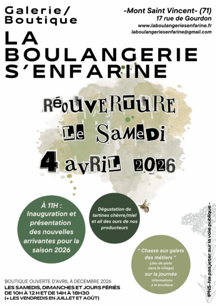 Inauguration de la Galerie Boutique de la Boulangerie s’enfarine saison 2026. Dégustation de tartines chèvre/miel et ail des ours de nos producteurs. Chasse aux galets des métiers : jeu de piste dans le village (informations à la boutique).