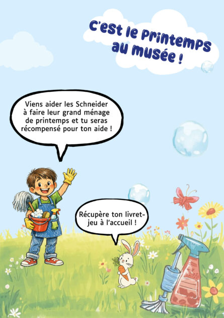 Pendant les vacances de printemps, viens aider les Schneider à faire leur grand ménage ! Demande ton livret-jeu à l’accueil et résous les énigmes !