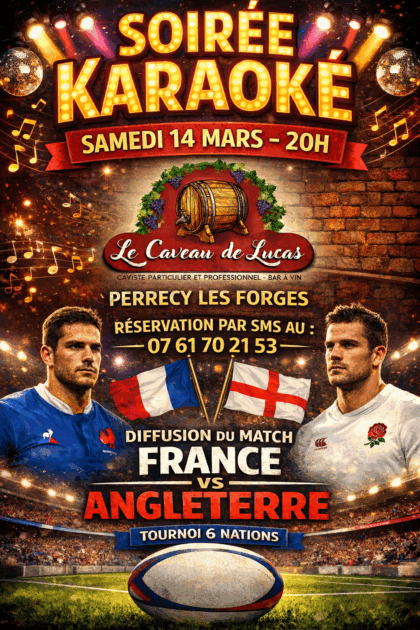 Soirée karaoké & rugby au Caveau de Lucas ! Venez passer une soirée festive et conviviale ! Karaoké pour mettre l’ambiance et montrer vos talents. Diffusion du match France vs Angleterre – Tournoi des 6 Nations. Sélection de boissons du caveau. Planches apéro charcuterie & fromage. Ambiance garantie entre amis ou en famille ! Places limitées – pensez à réserver dès maintenant ! Réservation par SMS au 07 61 70 21 53. On vous attend nombreux pour chanter, vibrer et partager un super moment !