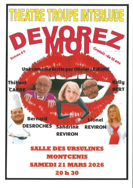 La troupe Interlude présente sa nouvelle pièce de théâtre “Dévorez-moi” d’Olivier Lejeune. Cette pièce sera jouée à la Salle des Ursulines à Montcenis. L’histoire tourne autour d’un grand chef de cuisine, d’une femme troublante et d’un rédacteur en chef d’un grand guide. Sur fond de vengeance, chantage et plat gastronomique hors normes. Venez nombreux !!!